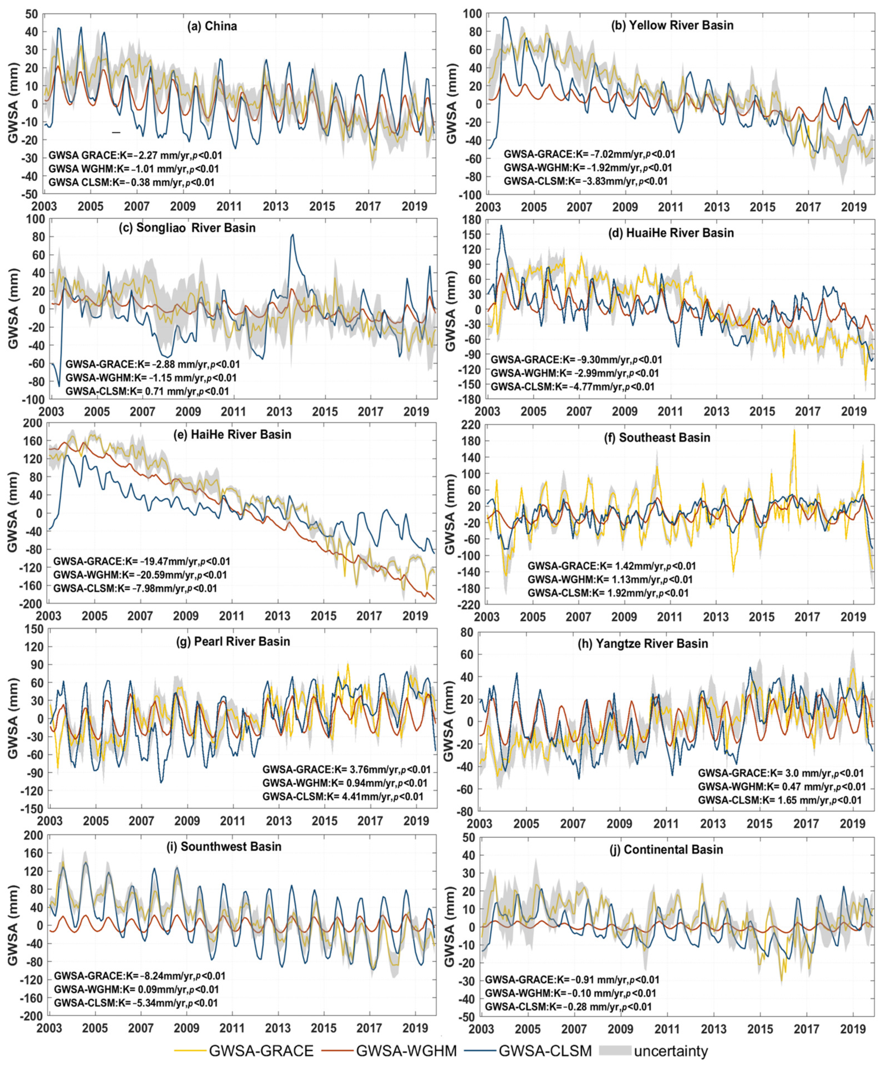 | Wang et al. [30] | GRACE CSR RL06 mascon; GLDAS NOAH v2.1 | −0.5 cm/yr (HHRB, 2003 to 2021) | |