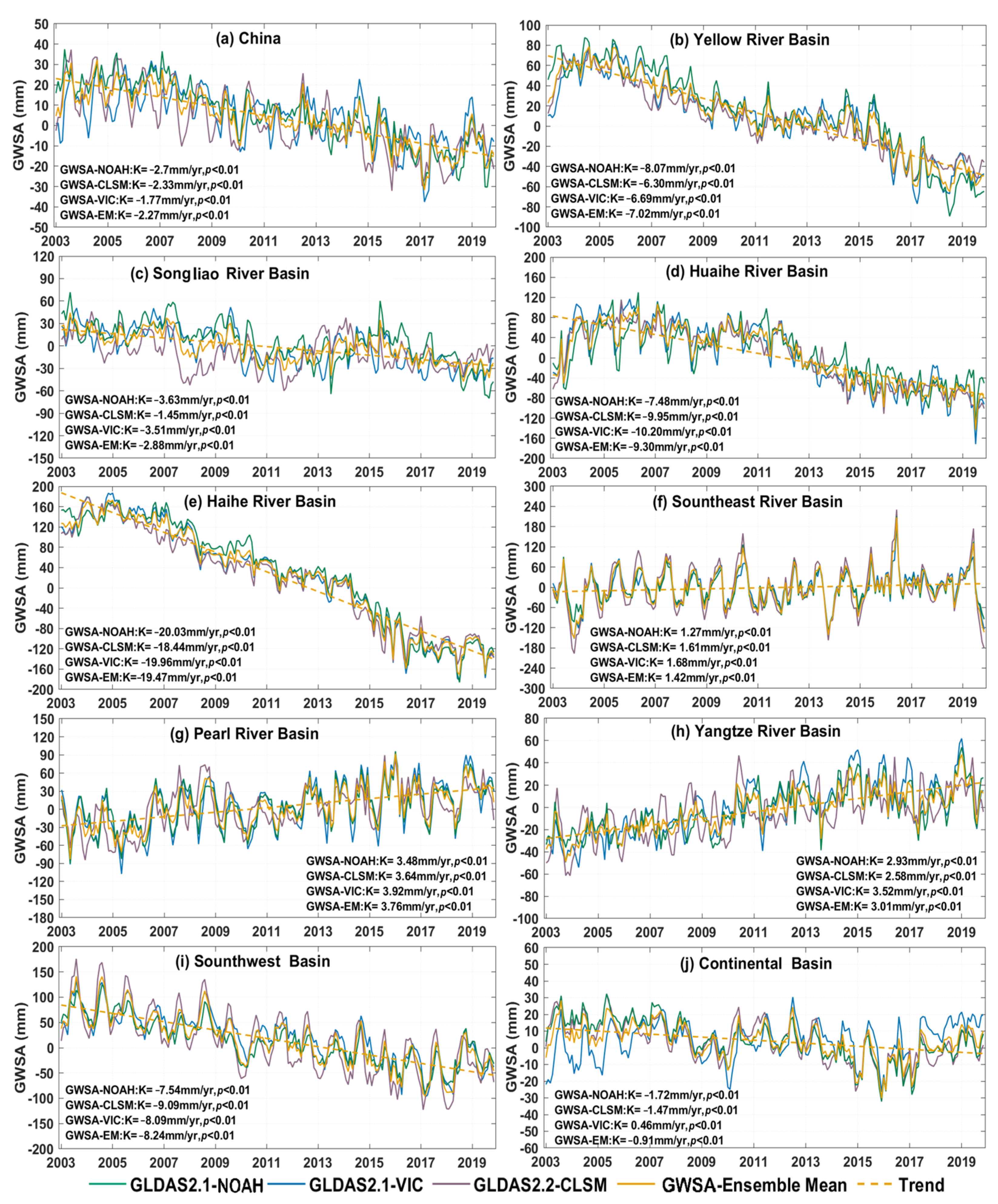 | Continental basin | Yin et al. [3] | GRACE CSR/JPL/GFZ RL06 mascon; GLDAS NOAH v2.1 | −3.28 mm/yr (CB, 2002–2017) |