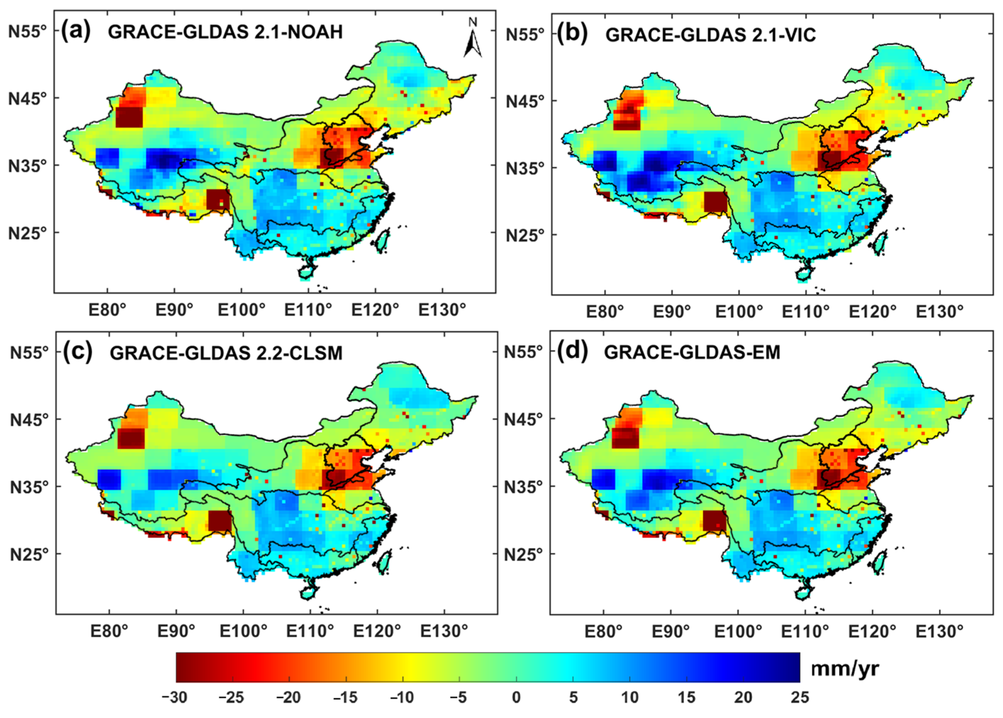 | Haihe River basin | Yin et al. [3] | GRACE CSR/JPL/GFZ RL06 mascon; GLDAS NOAH v2.1 | −9.15 mm/yr (2002–2017) |