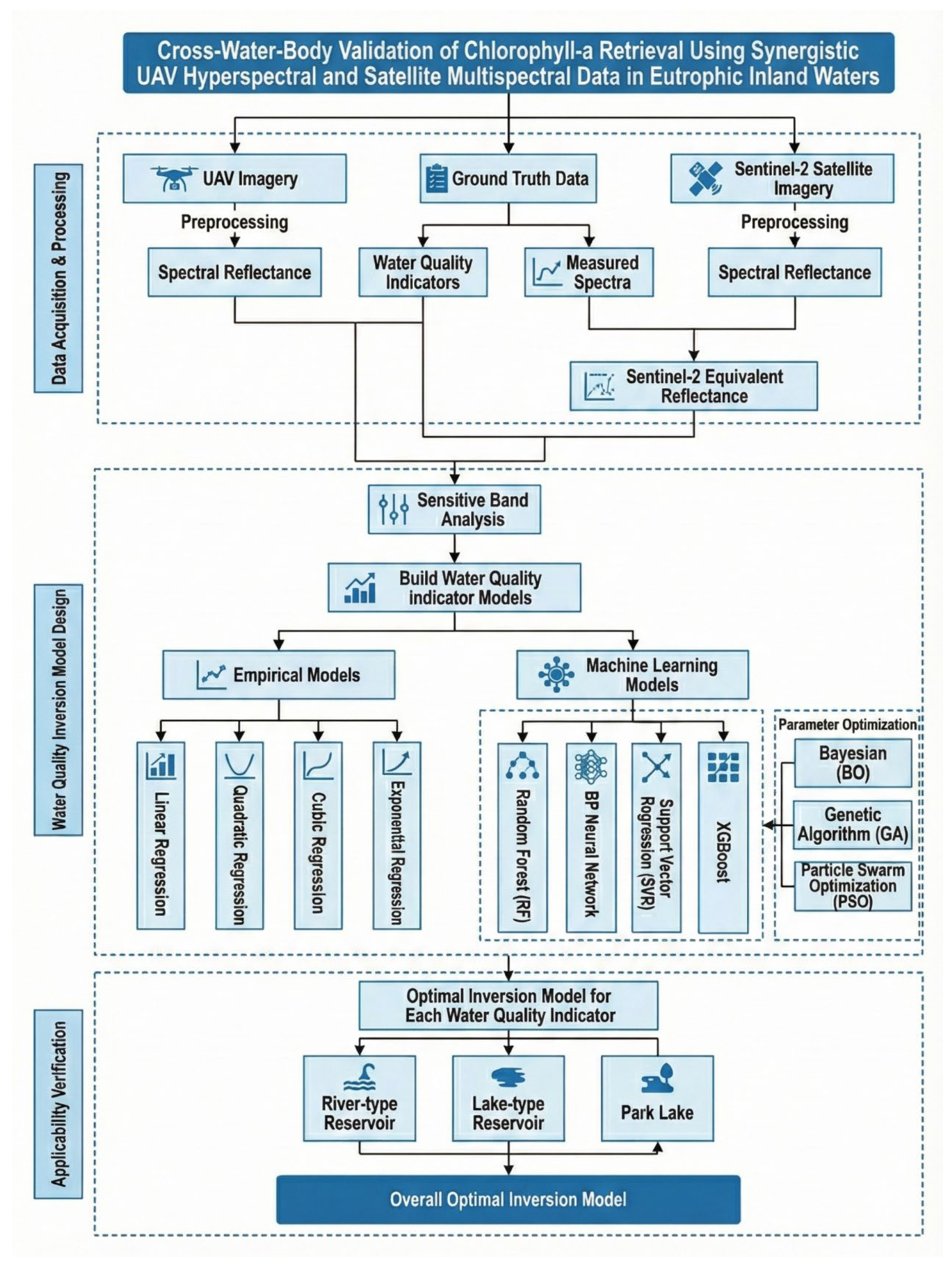 Empirical Models for the Sentinel-2 multispectral inversion selected the bands/band combinations with the highest correlation with Chl-a concentration as sensitive bands and constructed models using four regression methods.