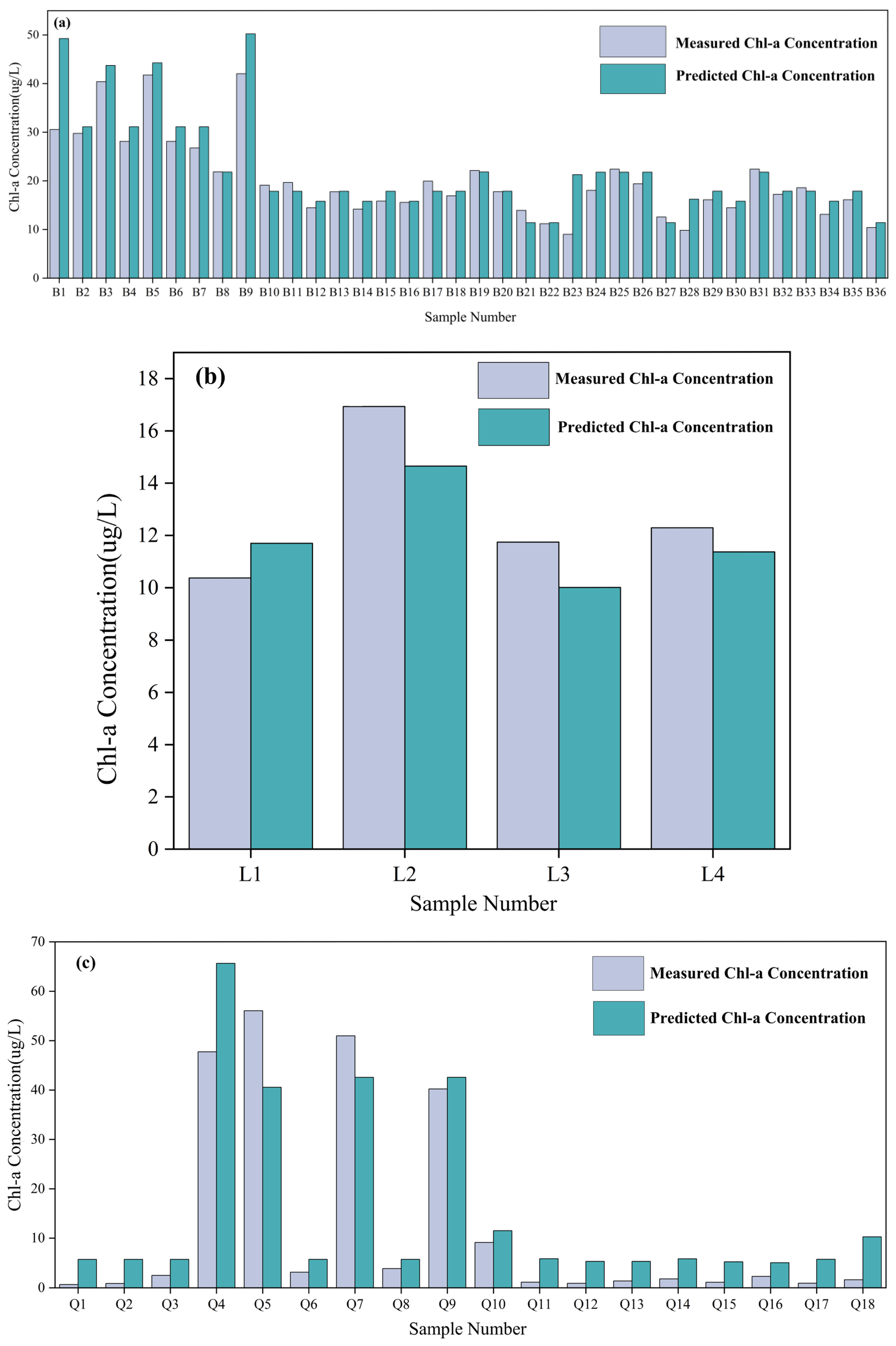 Table 13, under the Sentinel-2 satellite data source, the GA-optimized XGB (using three-band combinations as sensitive bands) achieved the optimal Chl-a inversion performance (R