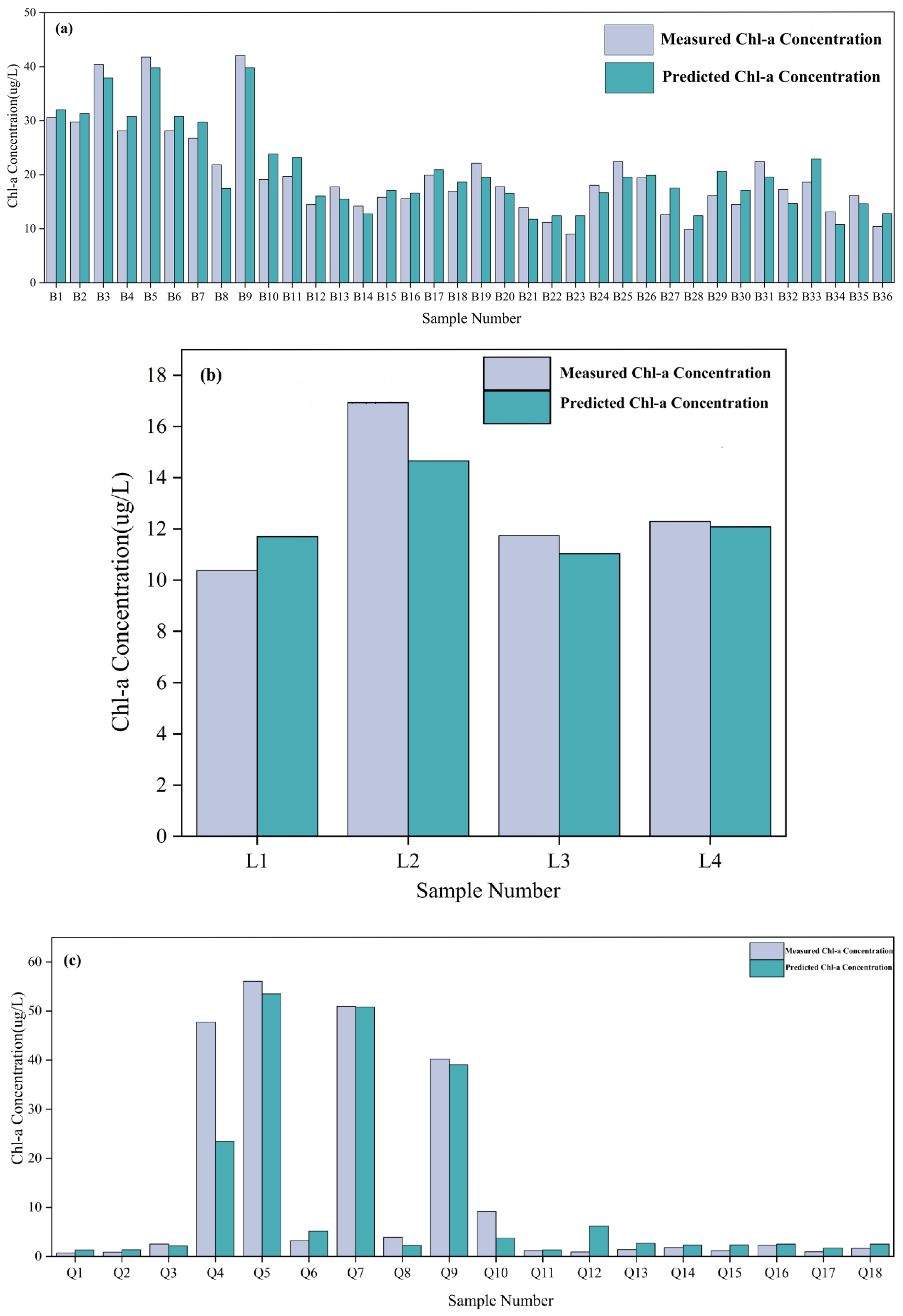 In general, the information from single bands is insufficient for accurate Chl-a prediction, while multi-band combinations can significantly improve the model’s predictive ability. Although the model errors are relatively large, except for single bands, the R2 values of all other combinations are >0.50, indicating that the accuracy of Chl-a inversion using the SVR model is relatively high.