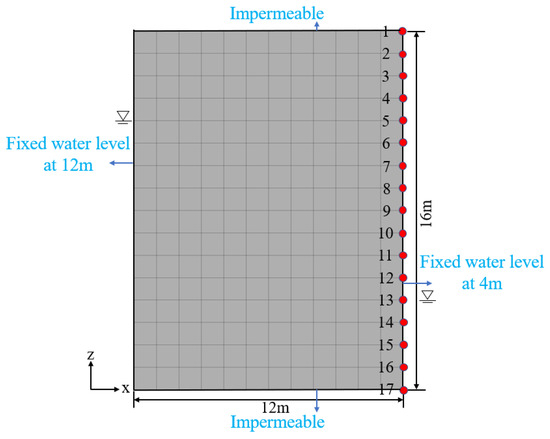 Figure 4 shows the calculation model, monitoring point layout, and calculation boundaries. The saturation permeability coefficient was 1.0 × 10−7 cm/s.