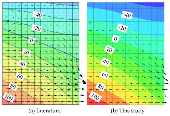 Figure 5a,b show the distributions of the pore pressure calculated in the literature [40] and this study, respectively.