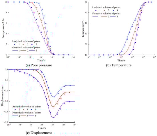 Figure 7 shows a comparison between the numerical and analytical solutions from the literature [41]. Figure 7a–c show the evolution curves of the displacement, pore pressure, and temperature over time, respectively.