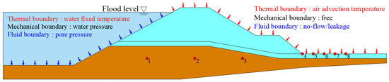 The initial conditions were determined via a steady-state calculation. In terms of seepage, the upstream water level adopted the average flood-season water level of Dongting Lake in 2020, with an elevation of 30.8 m. In terms of heat transfer, the surface temperature of the upstream lake was 25.0 °C, using the average surface water temperature of Dongting Lake during the flood season in 2020 [42]. The surface temperature of the upper embankment base was 22.5 °C. The bottom temperature of the model was 20.0 °C. The average temperature of Yueyang City in the summer of 2020 was 31.6 °C, and the boundary of convective heat transfer was adopted. In terms of mechanics, the bottom of the model was the global constraint, the two sides were the horizontal constraints, and the upstream embankment slope and embankment base surface were the pressure boundaries under the action of the initial water level.