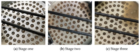 Figure 10 illustrates the seepage damage process. The damage process of the soil samples can be divided into the following three stages. In stage one, there is no obvious particle loss at the seepage outlet, steady seepage flows out slowly, and the seepage is relatively clear. In stage two, fine particle outflow appears in local parts of the surface, the scope of particle emergence gradually expands with an increase in the hydraulic gradient, and the amount of particle outflow and water seepage increases significantly. In stage three, with a further increase in the hydraulic gradient, many particles gush out from the surface, and water seepage further increases.