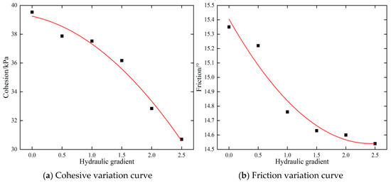 Figure 14 shows the shear strength curves of soil under different hydraulic gradients. With an increase in the hydraulic gradient, cohesion and friction both showed a nonlinear decreasing trend. Because the soil changed from unsaturated to saturated under the action of seepage and seepage damage occurred gradually. With the outflow of fine particles, the soil skeleton structure changed, resulting in a decrease in the shear strength.
