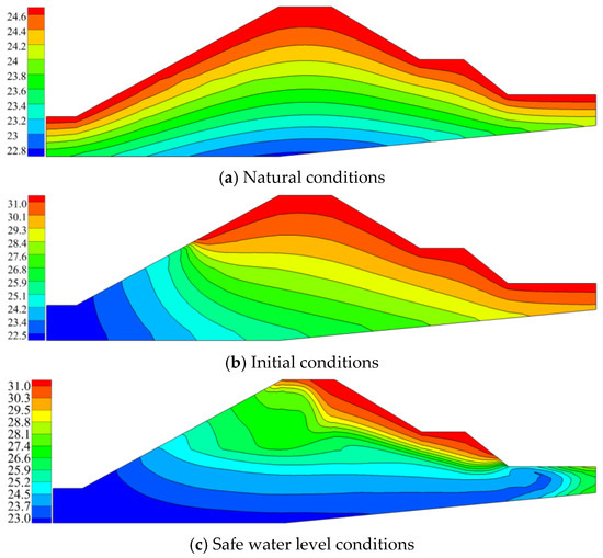 Figure 18 shows the temperature distribution for each set of conditions. Under natural conditions, the temperature field exhibits a layered distribution that gradually decreases from top to bottom. Under the initial conditions, the surface of the embankment continues to heat up owing to the high atmospheric temperature in summer, with a maximum temperature of 31.6 °C, distributed on the downstream surface of the embankment. Because the temperature of the water was lower than that inside the embankment, the temperature inside the embankment gradually decreased from the surface to the interior. The minimum temperature was 22.2 °C, distributed inside the upstream foundation of the embankment. The temperature inside the embankment foundation and downstream embankment toe gradually decreased under safe water level conditions. With a continuous increase in the seepage flow, the temperature gradient at the downstream embankment foot gradually increased, and there was a large temperature difference between the surrounding surface and embankment slope. At this time, the temperature at the downstream embankment slope was 31.6 °C, and that at the embankment toe was 23.6 °C.