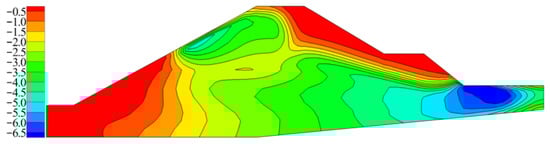 To provide a more intuitive analysis of the temperature changes caused by seepage, a temperature difference distribution diagram was drawn for the safe water level conditions, relative to the initial conditions, as shown in Figure 19. The temperature difference distribution was relatively complex, with a concentrated distribution at the upstream and downstream toes of the embankment. The extreme temperature difference was −6.7 °C, distributed at the downstream embankment toe.