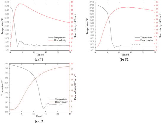 Measurement points P1, P2, and P3 on the embankment foundation were selected to draw a dual-axis duration curve of the seepage velocity and temperature, as shown in Figure 20. The temperature at each measurement point continuously decreased over time, and after reaching a minimum value, it tended to remain unchanged. The flow velocity at each measurement point initially increased sharply over time and then gradually decreased. The closer the measurement point was to the upstream, the earlier the phenomena of temperature drop and flow velocity increased.