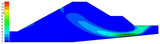 To further investigate the relationship between the temperature field and structural failure of the embankment, a strength reduction method was used to analyze the anti-sliding stability of the embankment under safe water level conditions. Figure 22 shows the distribution map of the maximum shear strain in the extreme state on the 25th day. A coherent slip surface was formed from the upper side of the embankment slope through the inner part of the embankment foundation to the toe of the downstream side.