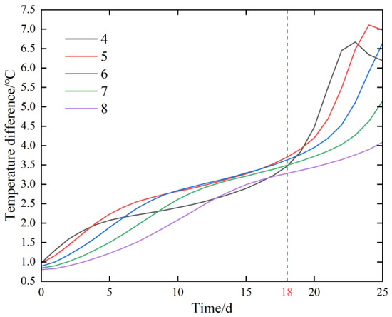 Figure 24 shows the absolute temperature difference duration curve of the measurement points on the downstream surface, compared with the initial state. The absolute temperature difference at each measurement point increased continuously over time, and the amplification increased sharply after 18 days. The absolute temperature difference at measuring point 5 at the end of the calculation was the highest, reaching 6.961 °C.