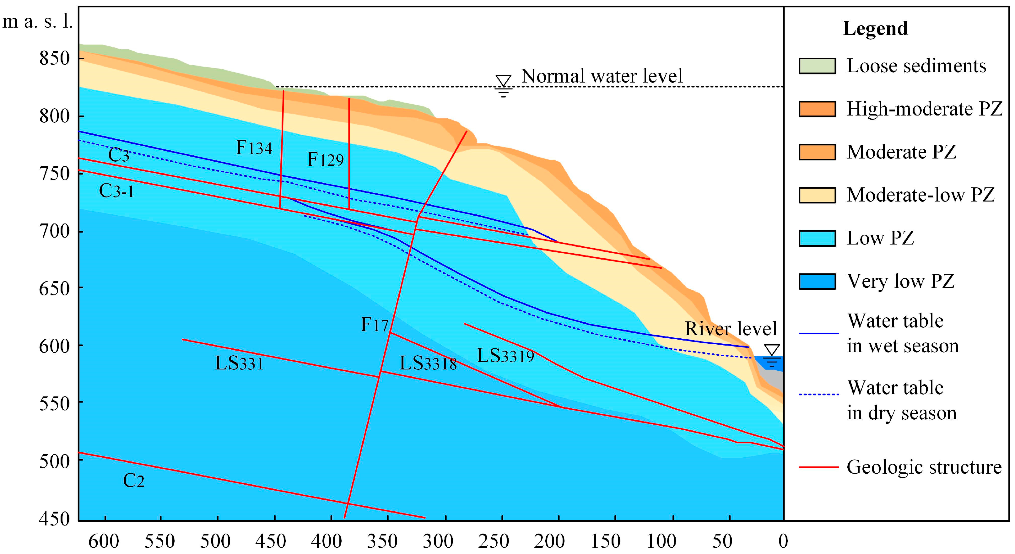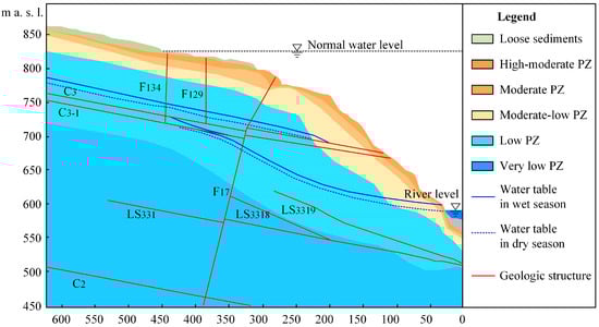 The predominant types of groundwater in the Baihetan dam site area are the pore water in the overburden layer and the bedrock fissure water. Atmospheric precipitation serves as the principal source of groundwater recharge in the dam site area. The groundwater systems of the left and right banks are independent. Due to the presence of the C2, C3-1, and C3 fault zones and the F14, F16, and F17 faults, the left bank groundwater is more active and stratified. Influenced by the relative diaphragm misalignment zone, groundwater on the left bank primarily undergoes horizontal recharge, with vertical recharge being insufficient. The right bank is characterized by limited infiltration and recharge due to the structural and stratigraphic inclinations within the slope, coupled with its steeper gradients. Consequently, most rainfall is funneled down the slope into the Jinsha River, resulting in weaker groundwater activity [24]. The hydrogeological conditions of the left bank of Baihetan are shown in Figure 2.