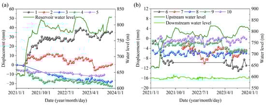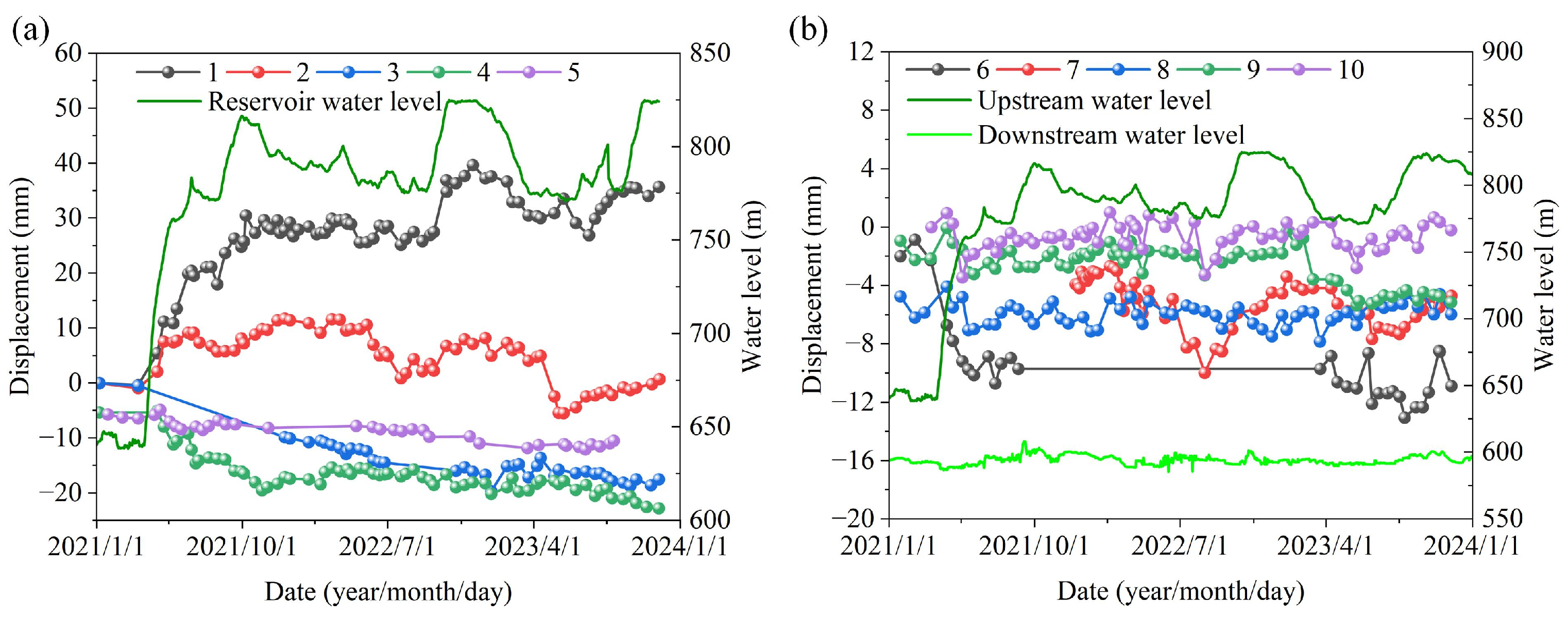 Time series process for monitoring data at the Baihetan valley measurement line. where (a) is the upstream side valley width measurement lines and (b) is the downstream side. Positive displacements indicate valley widening, and negative displacements indicate valley contracting.