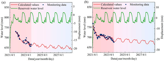 The area near the dam is a critical focus of engineering safety assessments. Observation Line 5 is expected to reach a relatively stable contraction value of approximately 10 mm by the end of 2025. After several years of reservoir water cycling, the river valleys within the areas of observation lines 3 and 4 will experience minor contractions. During the statistical period, the monthly deformation magnitude of the river valley in the observation line 3 area remained below 1 mm until June 2028. At that point, the total contraction of the river valley reached 19.63 mm. In the case of observation line 4, the river valley contracted by less than 1 mm per month in October 2027, leading to a total contraction of 23.66 mm. Figure 11 illustrates the predicted results for the typical measurement lines.