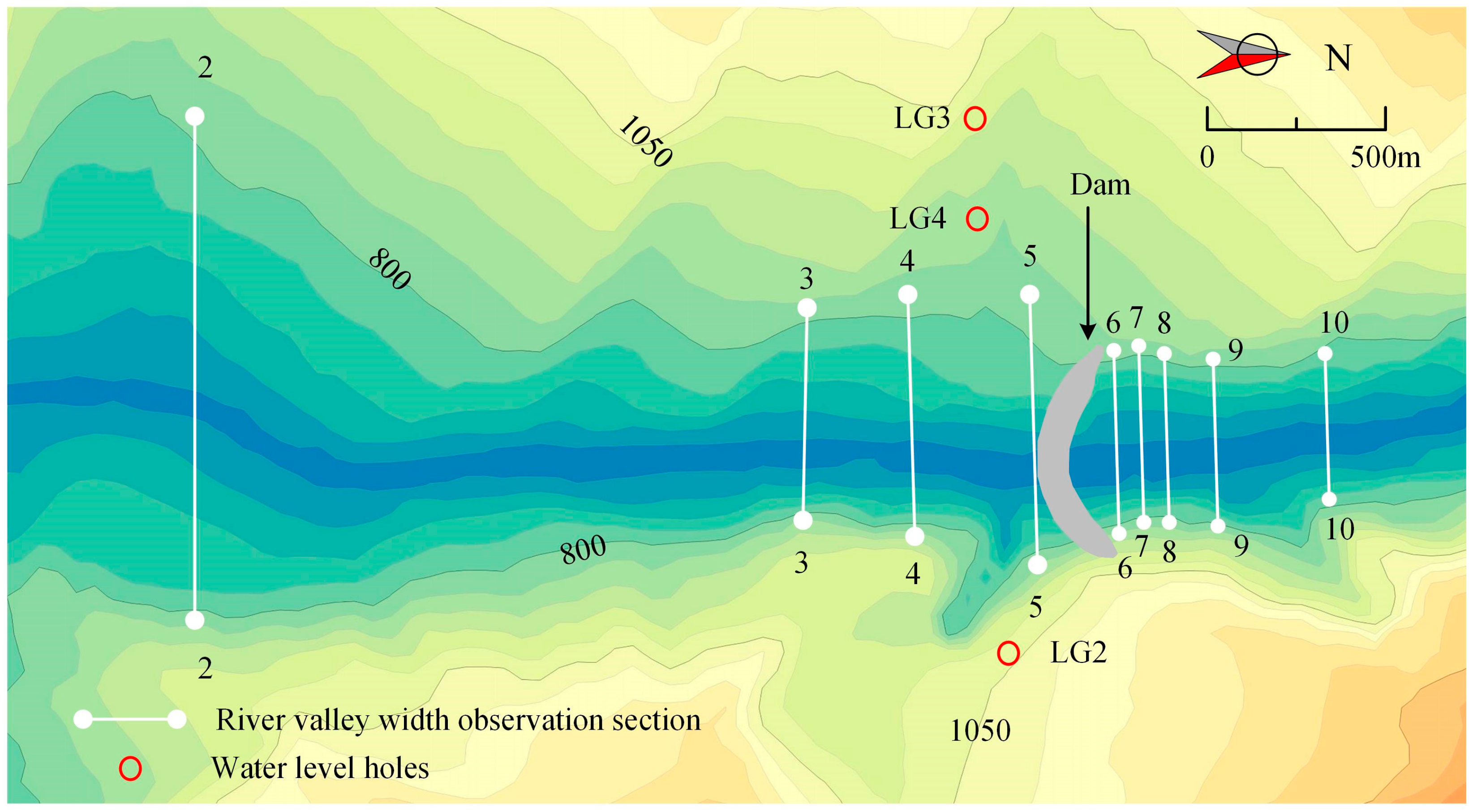 Ten observation sections were established upstream and downstream of the dam to monitor river valley contraction. Observation lines 1 to 5 are located upstream, and lines 6 to 10 downstream. The river valley width observation sections are shown in Figure 3. Each of the upstream sections has a single measurement line, all of which are situated at or near the 834 m elevation. The downstream valley width observation sections are arranged with multiple observation lines from low to high. This study only presents the monitoring data from measurement lines situated at or near an elevation of 834 m for each section.