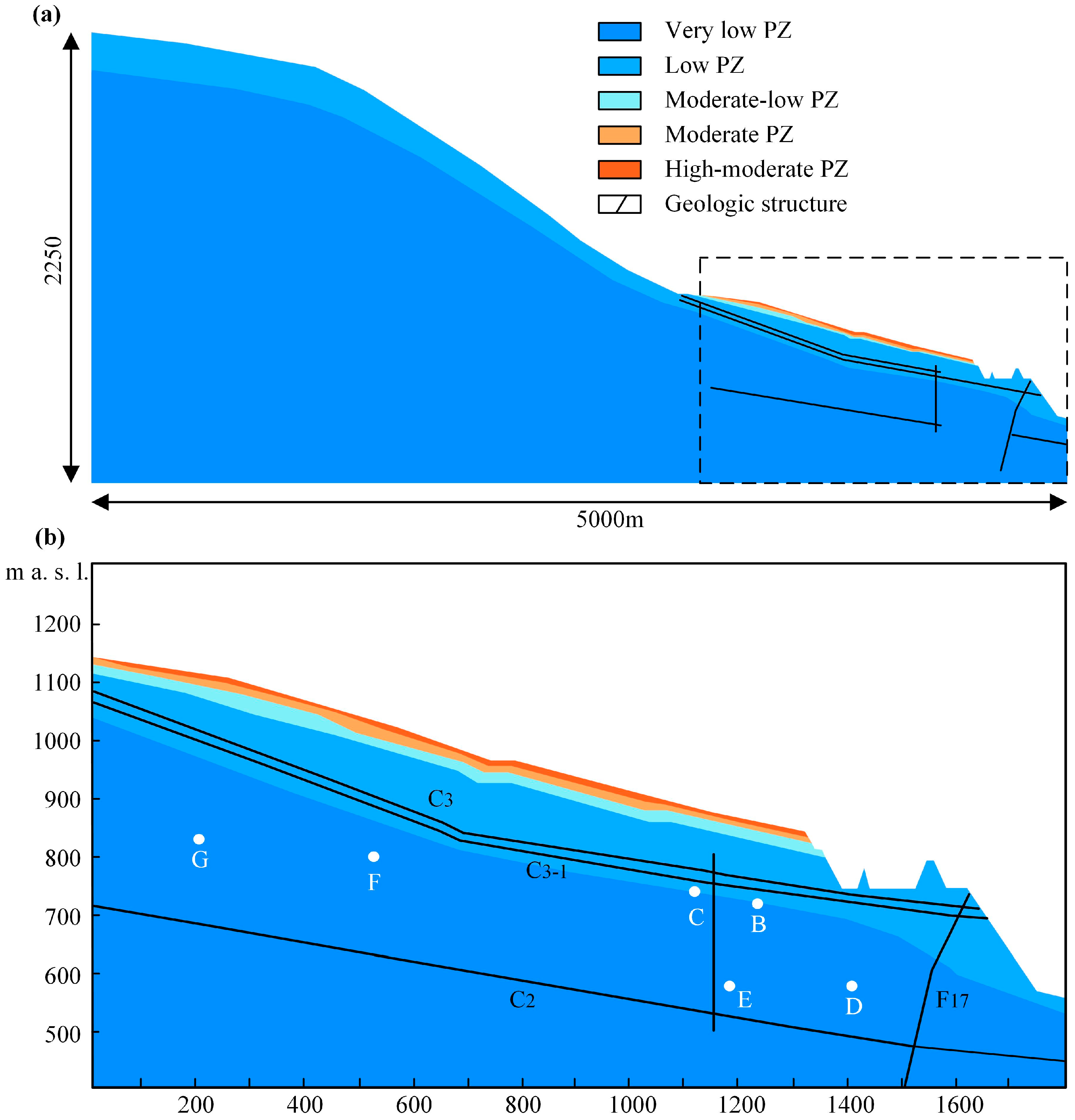 The computational model incorporates the following permeability zones: High-Moderate PZ, Moderate PZ, Moderate-Low PZ, Low PZ and Very Low PZ. It also includes the fault zones C3, C3-1 and C2, as well as the faults F14 and F17, which exhibit significant permeability sensitivity. The computational model is shown in Figure 5.