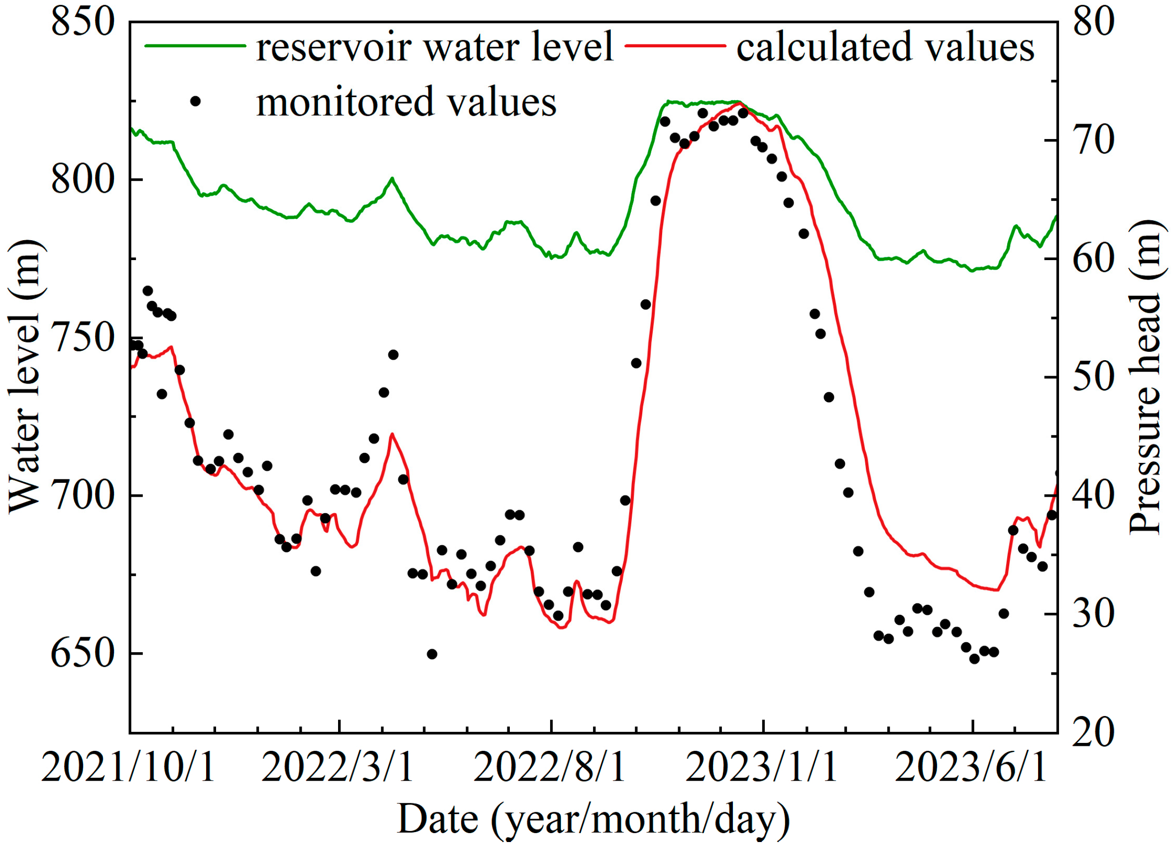 To validate the accuracy of the numerical simulation, the measured water level data from observation holes in the study area were compared with the calculated values at the exact locations. Figure 6 shows the measured and calculated time series of water levels at observation hole LG4, which is location as shown in Figure 3. The calculated pressure head values for this observation hole closely match the monitored data series, demonstrating consistency in both the synchrony and magnitude of water level changes, which confirms the validity of the seepage field simulation. Figure 7 shows the pressure head distribution in the study area during typical years. These figures show that the groundwater influence zone on the left bank of the Baihetan dam site extends approximately 1500 m after impoundment, with significant water level fluctuations occurring within 800 m of the riverbed.