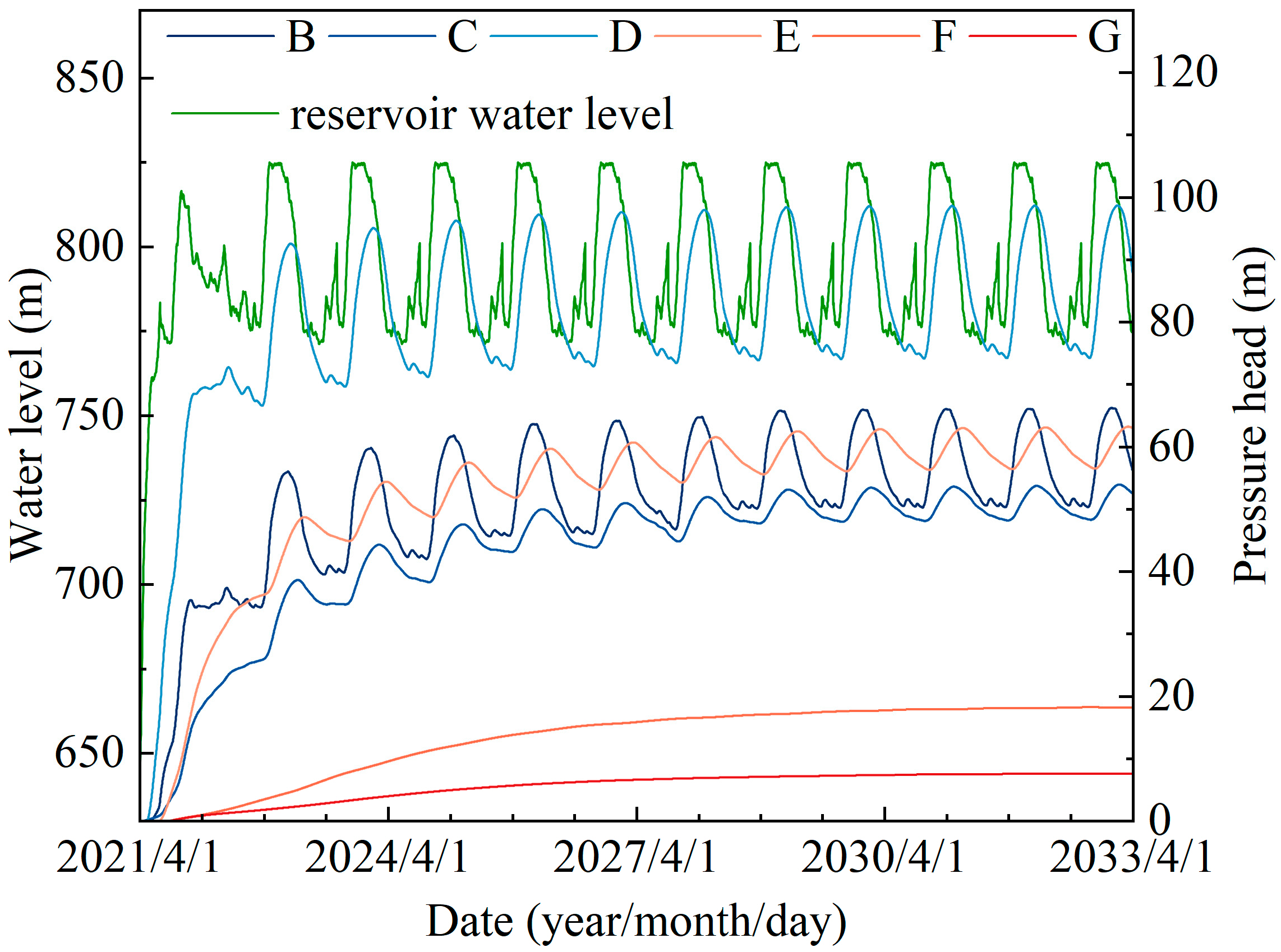 Seepage calculations indicate that the groundwater on the left bank, within 800 m of the riverbed, exhibits a more dynamic relationship with the reservoir water levels. This correlation gradually diminishes as the horizontal distance increases further into the mountain. The spatial distribution and temporal variation in the pressure head were analyzed in relation to monitoring points within the model. The locations of the monitoring points are illustrated in Figure 5b, and the corresponding time-series profile is presented in Figure 8. Within a radius of approximately 800 m from the riverbed, the pressure head within the mountain exhibits periodic fluctuations, with the cycle almost coinciding with the variations in the reservoir water levels. After multiple cycles of rise and fall in the reservoir water levels, these dynamic fluctuations exhibit nearly identical amplitude and phase. As the horizontal distance into the mountain increases, the dynamic relationship between groundwater and reservoir water levels progressively weakens. Notable characteristics include the reduced magnitude of pressure head increases and the gradual attenuation of periodic variations, which become imperceptible over time. Groundwater in these areas typically shows a gradual increase in pressure following the reservoir impoundment, with the rate of increase slowing progressively until the head value stabilizes.