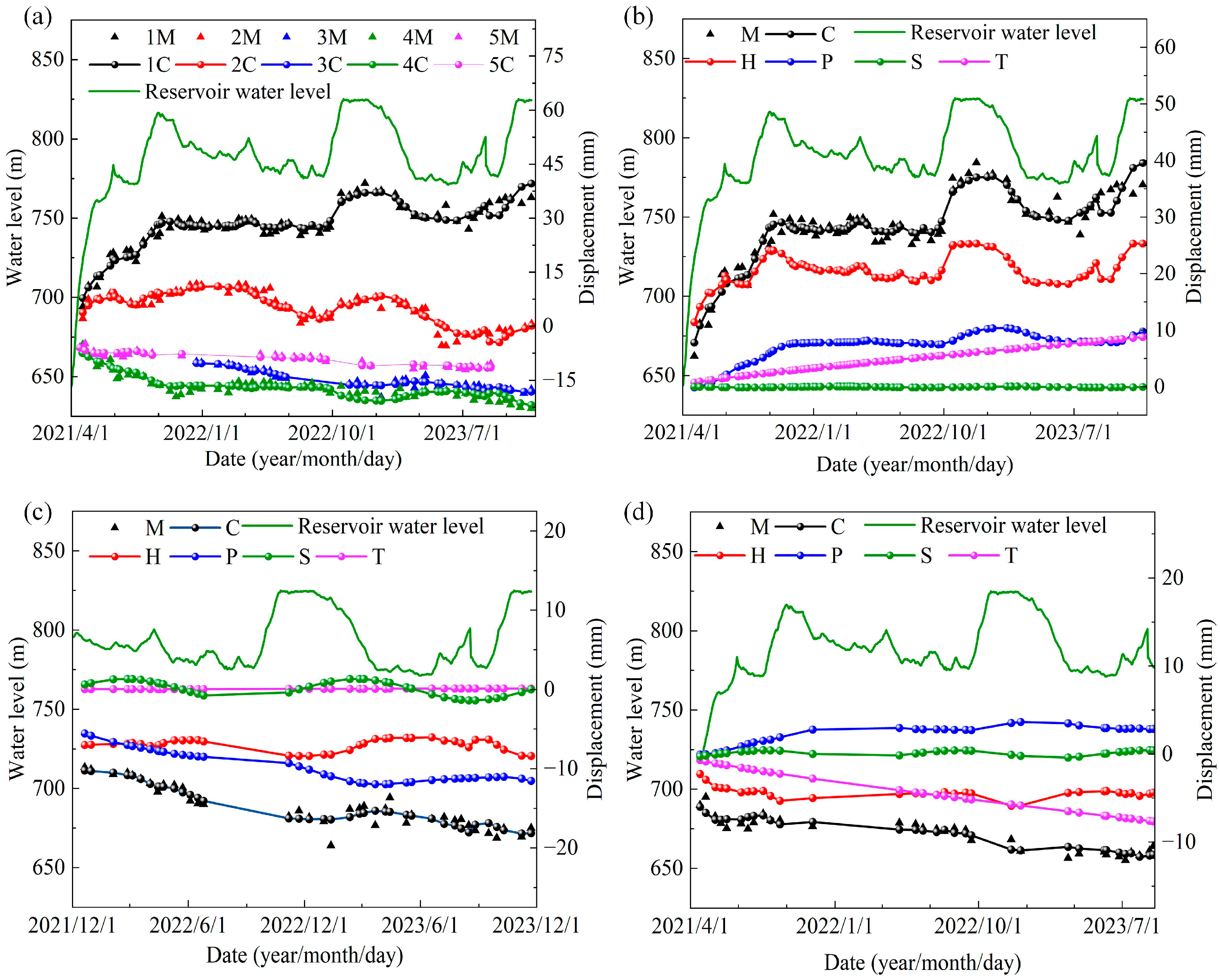 Lines 3, 4, and 5 are located closer to the dam. Extensive excavation was carried out on the upstream slope of the dam to accommodate the construction of hydraulic structures, resulting in a steeper slope downstream. Due to their steep topography, these areas experience limited influence from reservoir water. Furthermore, the deployment of impermeable curtains reduces the effects of groundwater closer to the dam, resulting in less valley deformation in these zones. The HPST hybrid model’s explanation for valley contraction is consistent with the deformation mechanisms revealed by numerical simulation methods [6].