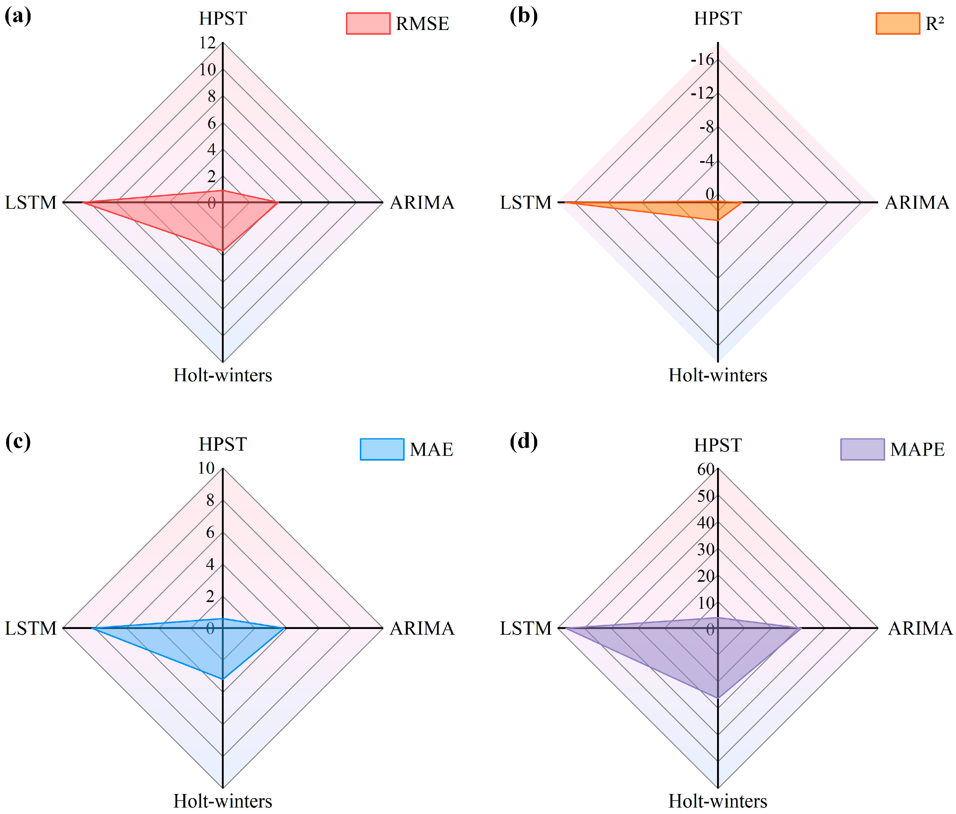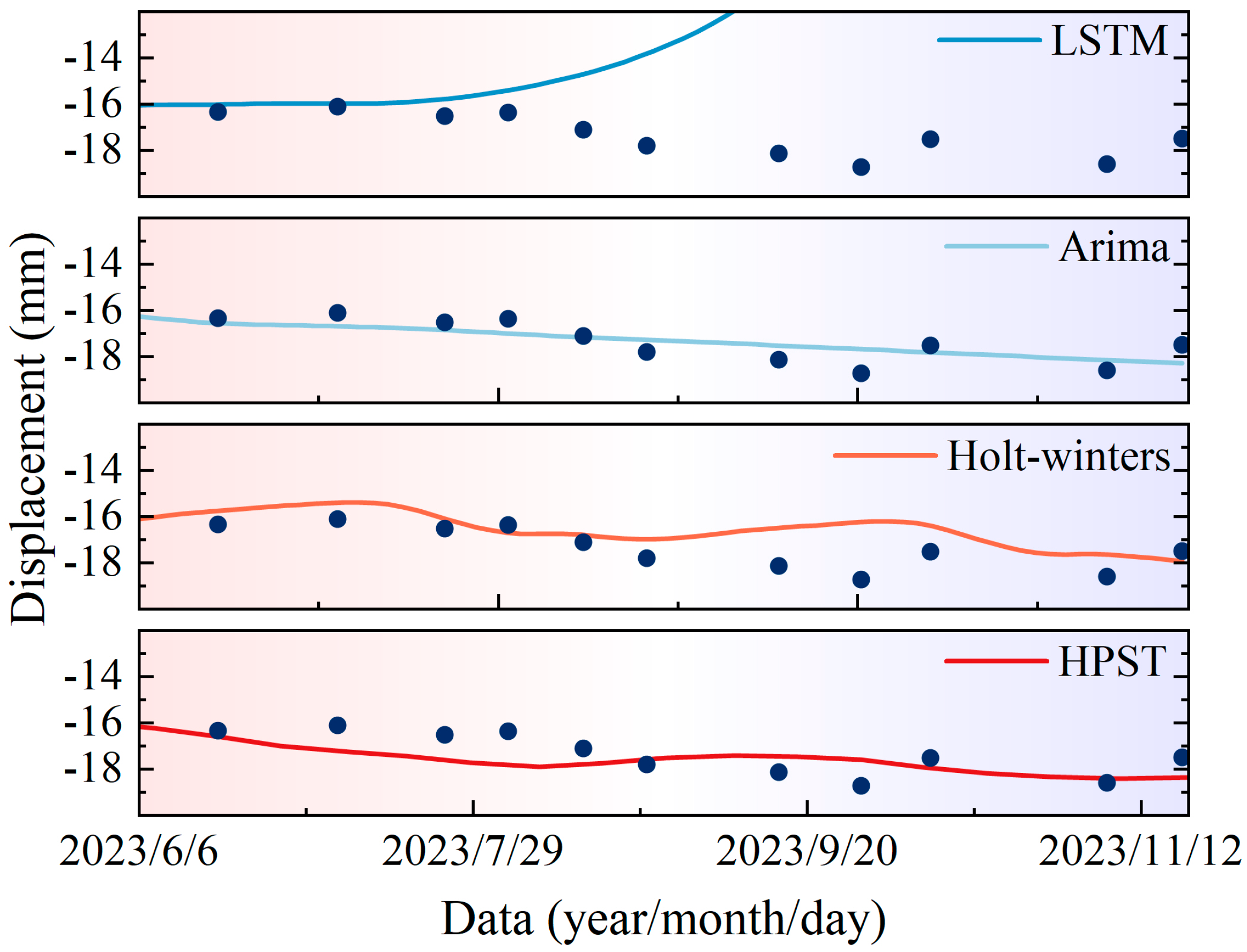The forecast results generated by these four models were collated over a period of nearly six months. Figure 13 shows the evaluation metrics for the predicted versus actual values, including RMSE, MAE, R2 and MAPE. Due to the small sample size, training of the LSTM model was constrained, resulting in suboptimal generalization performance. The ARIMA model’s suboptimal performance with seasonal and non-stationary data may compromise the reliability of forecasts. For time series with pronounced seasonal fluctuations, incorporating seasonal factors into the model explicitly may yield more accurate results. For multifactorial phenomena such as valley deformation, the Holt-Winters model’s overreliance on historical seasonal patterns also restricts predictive accuracy. Furthermore, its forecasting precision can be unreliable when handling sparse or highly volatile datasets. By contrast, the HPST model can utilize sparse, discontinuous data samples for training while integrating the key factors that influence valley deformation, thereby ensuring the accuracy of its long-term forecasts. However, constrained by limited monitoring data, the predictive model widely employed in this study may not have demonstrated its inherent advantages. Therefore, comparing the accuracy of the aforementioned predictive models only illustrates HPST’s potential superiority over other methods, rather than providing definitive proof of its superiority.