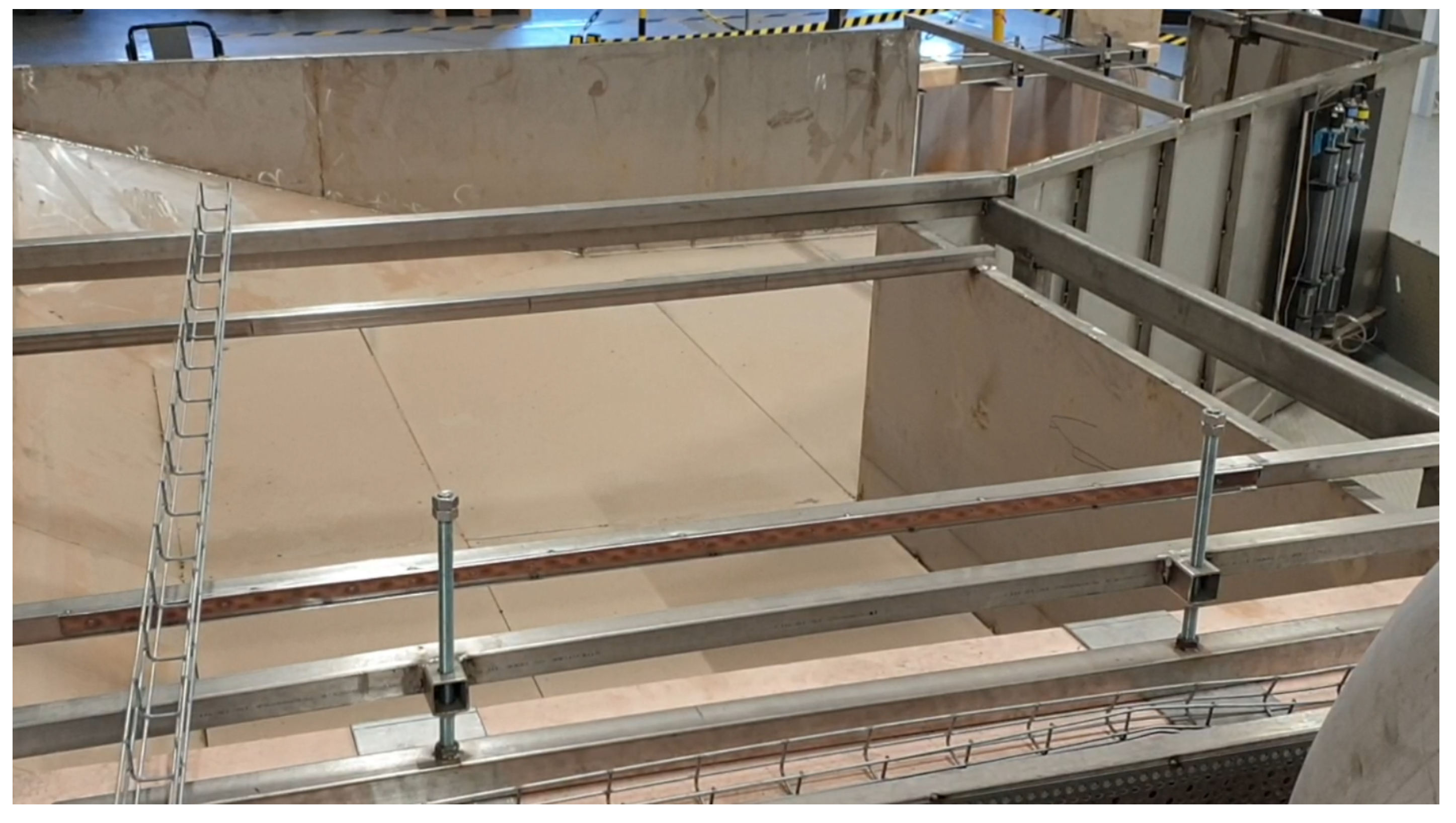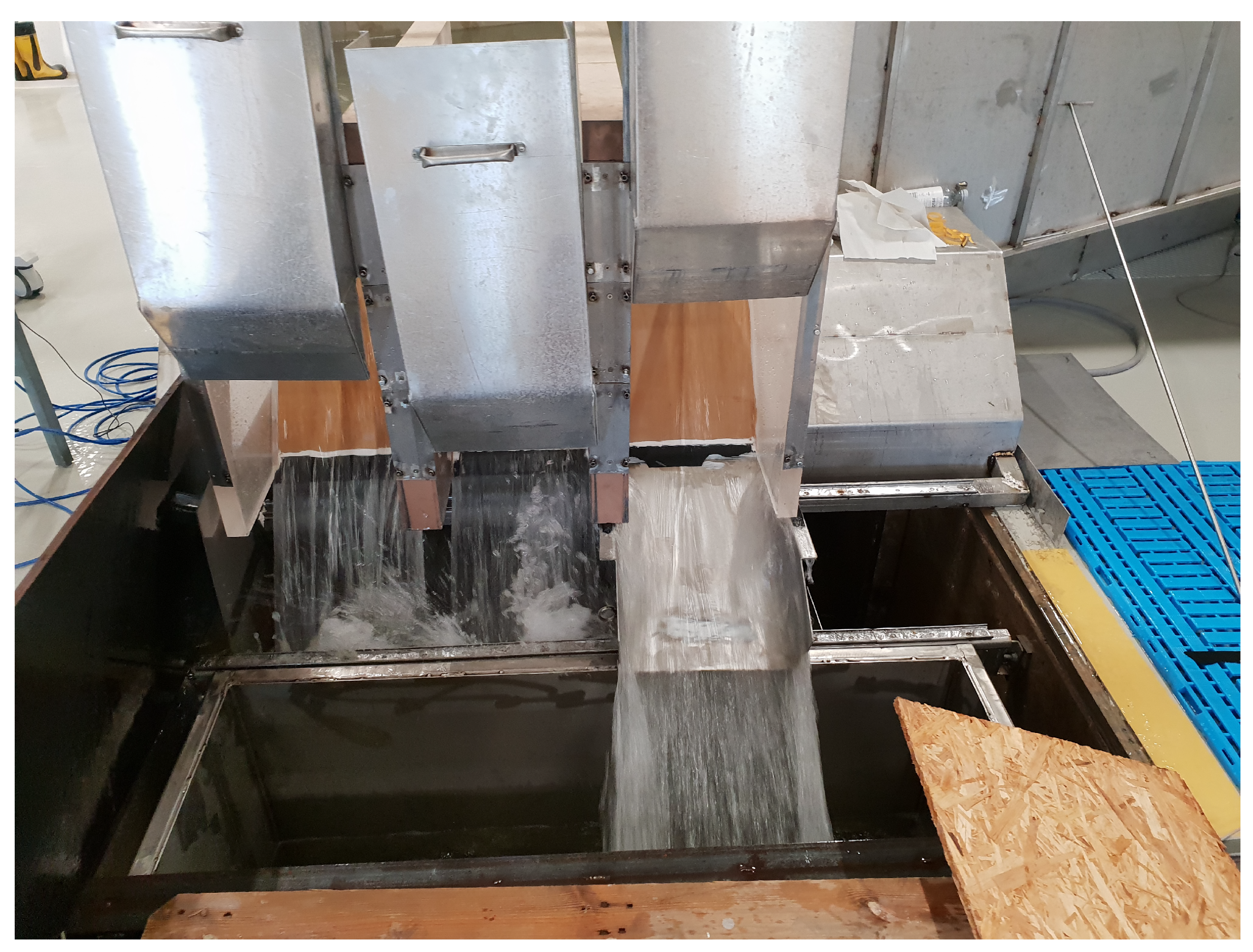 - Hedberg, P.A.M.; Hellström, J.G.I.; Andersson, A.G. Shallow channel spillway flow distribution experiments. In Proceedings of the 9th IAHR International Junior Researcher and Engineer Workshop on Hydraulic Structures, Zurich, Switzerland, 20 June 2024. [Google Scholar] [CrossRef]