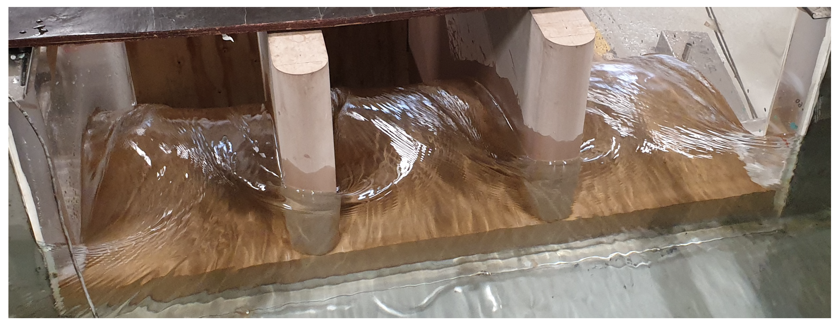 - Jeon, J.; Kim, Y.; Kim, D.; Kang, S. Flume Experiments for Flow around Debris Accumulation at a Bridge. KSCE J. Civ. Eng. 2024, 28, 1049–1061. [Google Scholar] [CrossRef]