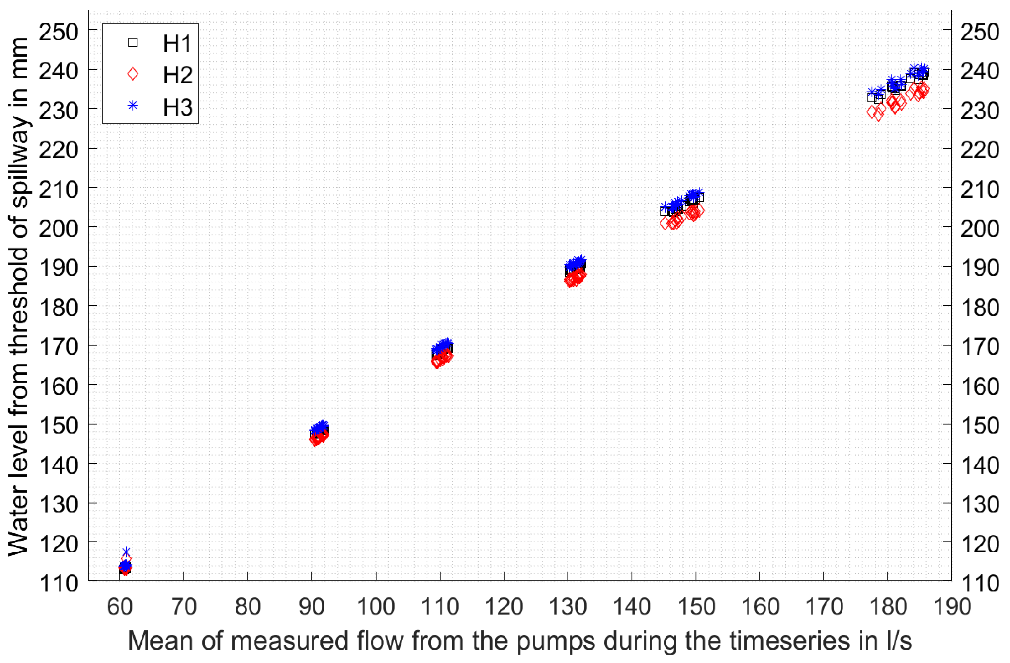 | Inflow [l/s] | H1 [mm] | H2 [mm] | H3 [mm] |