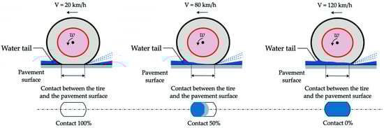 Surface runoff in a thin water layer on pavement during rainfall is hydraulically complex, attracting considerable research interest. The presence of water sharply reduces the friction between tire and pavement, with the coefficient dropping to about 0.10 [1]. For example, when a vehicle travels at 20 km/h, the tire pavement contact area is essentially 100%. At 80 km/h, the contact is roughly 50%, and it continues to decline with speed; at 120 km/h, virtually no direct contact remains [1,7]. Figure 1 illustrates how the contact area diminishes as speed increases.