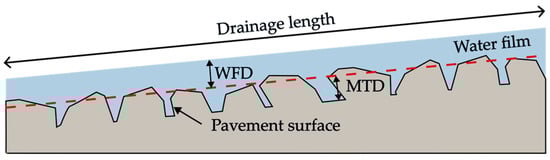 The mean texture depth (MTD) was not computed within the numerical model but was adopted directly from the experimental studies used as data sources. In all analyzed cases, MTD values were determined experimentally by the original authors using standardized pavement texture measurement methods. These reported values were used as fixed input parameters in the simulations, ensuring consistency with the experimental conditions under which water film thickness measurements were obtained.