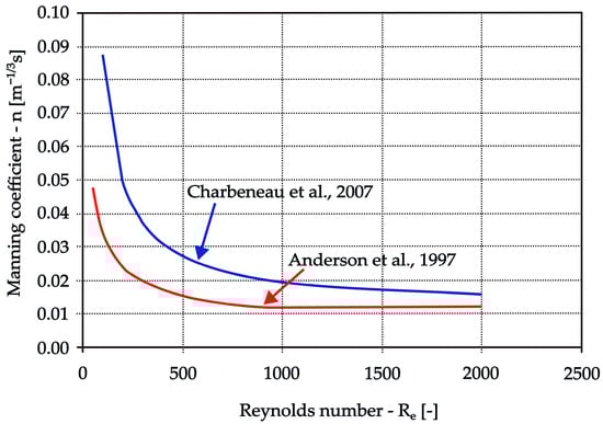 Using Equation (8) yields slightly higher values of the Manning roughness coefficient than Equation (7). A comparison of the two equations is presented in Figure 3 as a function of the Reynolds number.