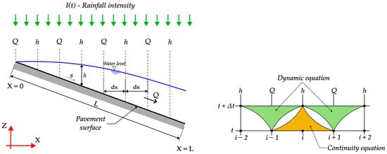 The applicability of the diffusion-wave approximation was assessed through an order-of-magnitude scaling analysis of the governing terms in the Saint-Venant equations. For the investigated conditions, water film thicknesses were on the order of 10−3 m, while characteristic flow velocities were on the order of 10−2–10−1 m/s. Under these conditions, the local and convective acceleration terms are at least one order of magnitude smaller than the gravitational and friction terms. This is particularly valid for the relatively short pavement lengths (7.5–20 m) and slopes ranging from 0.5% to 8% considered in this study. Therefore, neglecting inertial terms and adopting the diffusion-wave approximation is justified for the thin-film flow conditions analyzed here. For the discretization of the equations of the diffusive wave mathematical model and the formation of the numerical model, a division into cross-sections using a staggered computational grid and an explicit numerical scheme is used in Figure 4 [32].
