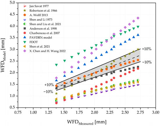 In the previously shown figure, intervals of relative error of ±10% are also displayed. This is due to the fact that the water film thicknesses are relatively small and difficult to measure accurately, which naturally results in larger relative measurement errors. According to the presented equations, within the interval of −10% to 10% relative to the measurements, the best agreement is achieved with the friction coefficient Equation (4) by [9]. Slightly poorer agreement is observed with Equation (2) by Robertson et al. [18]. The equation by Anderson et al., (7) for estimating Manning’s roughness coefficient shows good agreement with measurements for water film thicknesses up to 2.0 mm, but larger deviations occur for greater thicknesses [22]. The equations by X. Chen and H. Wang, the PAVDRN model from FDOT, significantly overestimate the water film thickness, while the equations by Charbeneau et al., Shen and Liu et al., Shet et al., and Shen and Li tend to underestimate the water film thickness in this case [6,19,21,24]. The goodness of fit, expressed by the Mean squared error and mean absolute percentage error for the applied equations, is presented in the following table. The smallest deviations in terms of MAPE are observed for the equations by Robertson et al. and A. Wolff, both with errors less than 10%. All other equations exhibit deviations greater than 10%, with the largest MAPE value of 48.10% shown by the equation of X. Chen and H. Wang [9,18,24].