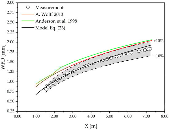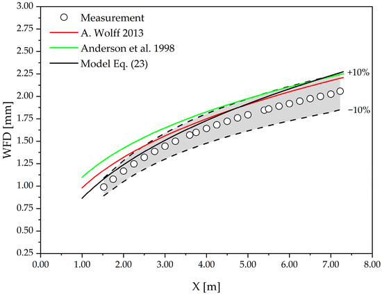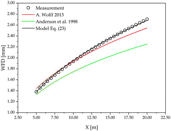 The proposed model estimates flow resistance using only the Froude number, which is defined based on the mean pavement texture depth and the flow velocity in the direction of motion (Equation (5)). The velocity of water flow during rainfall inherently depends on rainfall intensity, pavement slope, and mean texture depth. This leads to the conclusion that all these influencing factors are captured through the Froude number. Although a formal global sensitivity analysis was not performed, the influence of key parameters such as pavement slope, mean texture depth, and rainfall intensity is implicitly reflected through their combined effect on flow velocity and water film thickness, which together define the Froude number. The proposed formulation therefore captures parameter sensitivity in an integrated manner rather than through explicit independent variables. A dedicated quantitative sensitivity analysis aimed at isolating the individual contribution of each parameter represents an important direction for future research. In practical terms, this means that as resistance increases, the thickness of the water film and the runoff velocity also increase. For this formulated model, the results for the test case are presented in Figure 6, together with the equations proposed by Anderson et al. and A. Wolff [9,22]. The figure demonstrates that the developed model shows good agreement with measurements, and the obtained water film thickness results track the measured data well. The equation by Anderson et al. yields somewhat lower water film thickness values across the analyzed section for which measurements are available [22]. The equation by A. Wolff provides better results than Anderson et al., is equation, with the model tracking measurements well in the 5.0 to 10.0 m range [9,22]. However, for the remainder of the section beyond 10.0 m, it deviates from the measured values, with differences in water film thickness reaching approximately 0.21 mm at the end of the section.