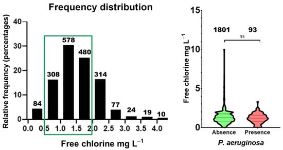 Frequency distribution of free chlorine levels in P. aeruginosa contaminated and not contaminated pool samples. Left, histogram showing the concentration of free chlorine in ranges of 0.5 mg/L. Green frame indicated appropriate values. Right, violin plot representing individual levels of free chlorine in pools contaminated or not with P. aeruginosa. Statistical comparison between contaminated and non-contaminated samples was performed using the Mann–Whitney test (ns, p = 0.1970). The number of samples included in each interval (n) is also indicated.