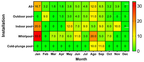 When stratified by installation type (Supplementary Table S2), the rise was primarily attributable to whirlpools (15/78; 19.2%) and outdoor pools (34/346; 9.8%), whereas indoor pools and cold-plunge pools contributed minimally and exhibited very low sample numbers in winter months. Importantly, some installations (particularly cold-plunge pools and outdoor pools) had little or no sampling during the low season, explaining the apparent “winter peak” seen in aggregated heatmaps but not supported by 2019 data. Formal trend testing across years was not applied due to heterogeneous monthly sampling density inherent to regulatory surveillance data.