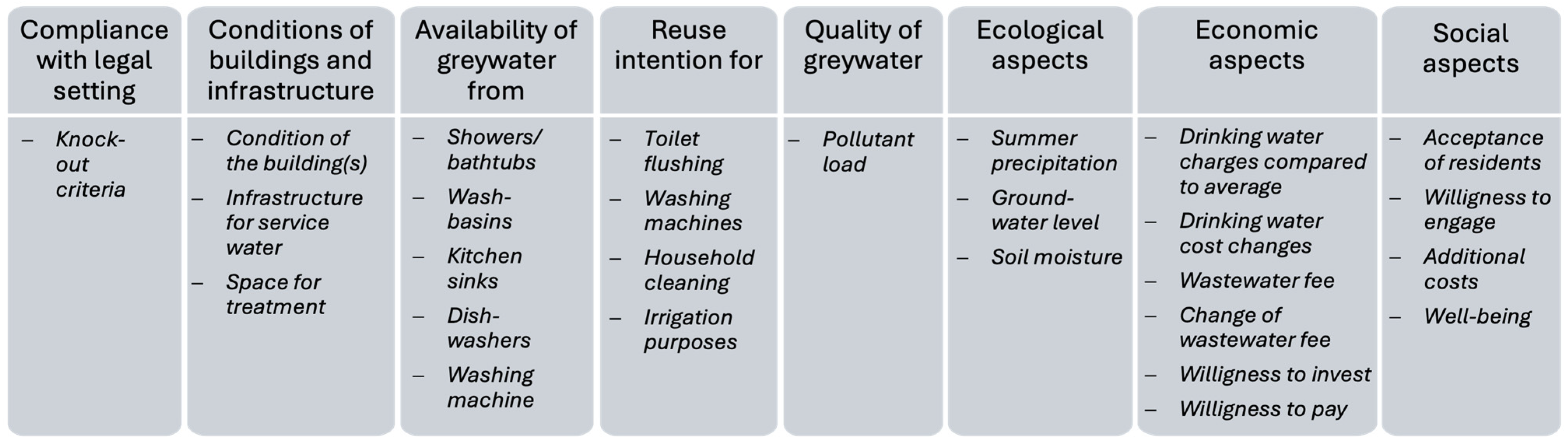 - Legal compliance as a non-negotiable prerequisite: Treating the legal framework as a knock-out criterion proved essential, as regulatory permissibility determines whether greywater reuse can be pursued at all.