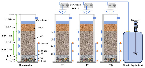 Acrylic cylindrical columns were selected as the main structure for the bioretention system experimental devices. Three types of column-based bioretention systems were set up: iron-carbon-based bioretention system (IB), traditional sand-based bioretention system (TB), and biochar-based bioretention system (CB). A schematic diagram of the bioretention system is shown in Figure 1. The main structure of the device consists of an organic glass cylindrical column with an inner diameter of 200 mm and a height of 1000 mm, with a wall thickness of 5 mm. The inner surface of the column was roughened to prevent wall flow phenomena. The overall structure of the device, from bottom to top, includes a 100 mm drainage layer, a 50 mm transition layer, a 500 mm media layer, a 250 mm planting soil layer, a 50 mm water storage layer, and a 50 mm excess-height layer. To prevent soil and media material from seeping downward, zeolite is added above and below the media layer. The structure and substrate composition of the bioretention system are detailed in Table S1. Geotextiles were placed in each layer to prevent the loss of substrates, which could affect effluent water quality. A perforated collection pipe was placed at the bottom of the drainage layer to facilitate drainage, with hole diameters of 2 mm. The effluent pipe extends upward to form an outlet, creating submerged zones of varying heights. A PVC perforated pipe with a height of 75 cm and a diameter of 4 cm was placed in the center of the device for collecting samples from different substrate layers. Four sampling ports were set along the vertical direction of the external wall of each device for substrate sampling.