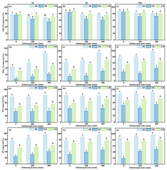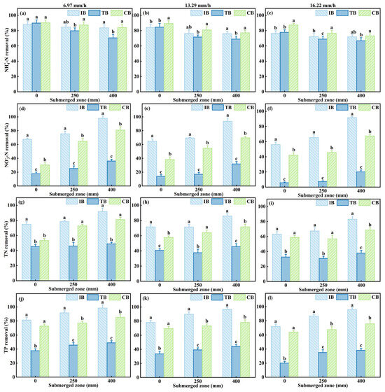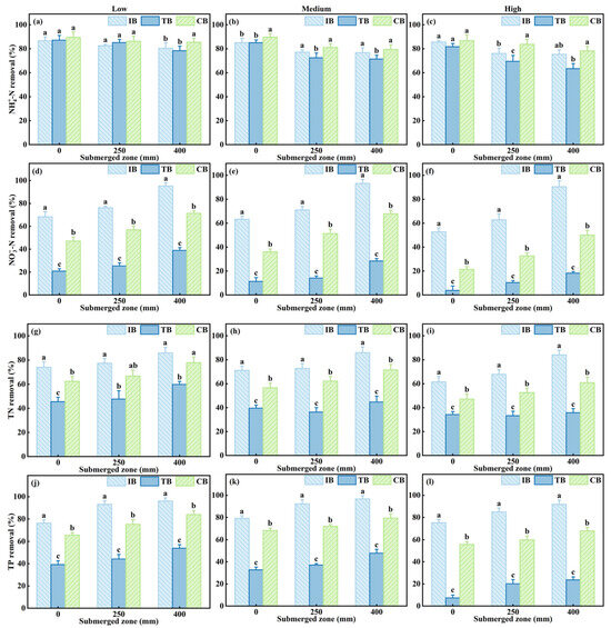 Removal rate of (a–c) -N, (d–f) -N, (g–i) TN, and (j–l) TP by the bioretention system under different submerged zone depths and influent concentrations. If three error bars beneath each submerged zone display different letters, this indicates significant differences (p < 0.05) between groups.