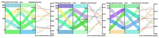 Changes in total iron and ferrous iron concentrations in the effluent of iron-carbon bioretention systems with different submerged zone depths under (a) rainfall intensity, (b) influent concentration, and (c) antecedent drying duration. The four axes from left to right represent inundation zone height, iron morphology, rainfall conditions, and effluent iron concentration.