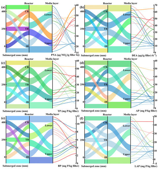 The potential nitrification ability (PNA) and denitrification enzyme activity (DEA) of the three bioretention systems under different submerged zone depths are shown in Figure 6a,b. It can be observed that the upper layer of the filler in all systems exhibited high potential nitrification capacity, which decreased with increasing submerged zone depth. The CB group maintained a high nitrification capacity in the upper filler, with a potential nitrification rate of 57.84 µg /(g filler·h) under a 0 mm submerged zone. In contrast, the IB group had the weakest nitrification capacity (20.14–23.69 µg /(g filler·h)). In the lower layer of the filler, the IB group maintained stable nitrification capacity (16.09–18.49 µg /(g filler·h)). For the TB and CB groups, as the submerged zone depth increased, their nitrification capacities significantly decreased to 15.2 µg /(g filler·h) and 22.39 µg /(g filler·h), respectively. Regarding denitrification potential, the lower layer of the filler in all systems exhibited higher denitrification potential than the upper layer, and this potential increased with the submerged zone depth. The IB group showed significantly higher denitrification potential than the TB and CB groups, especially in the lower layer. Under a 400 mm submerged zone, the denitrification potential in the IB group reached 64.52 µg/g·h−1.