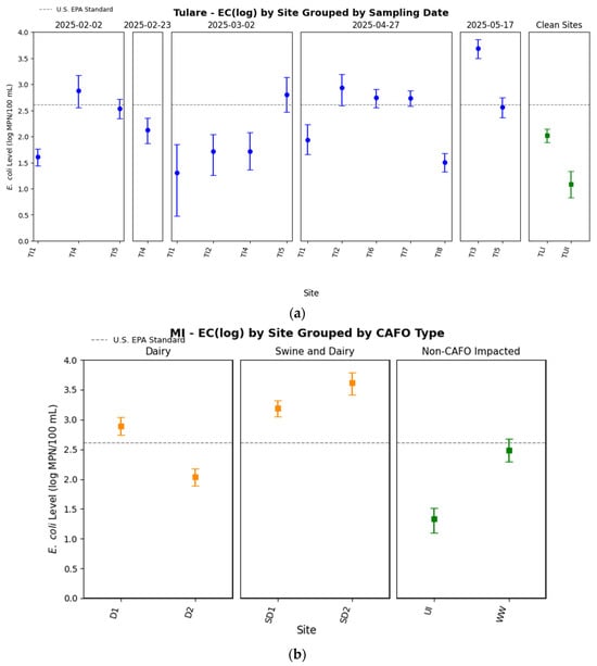 E. coli level (log MPN/100 mL) detected by modified IDEXX method in Tulare County, CA (a) and Clayton, MI (b). The U.S. EPA recommended level for E. coli in recreational water is 410 CFU/100 mL (2.61 log10MPN/100 mL shown in dashed line).
