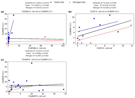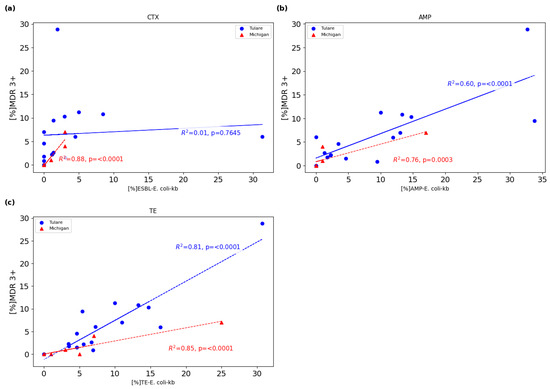 Correlation analysis for (a) percentage of ESBL-E. coli-col to percentage of MDR-E. coli Tulare (R2 = 0.70, p < 0.0001), Michigan (R2 = 0.03, p = 0.737); (b) percentage of TE-E. coli-col to percentage of MDR-EC Tulare (R2 = 0.22, p = 0.238), Michigan (R2 = 0.54, p = 0.030); (c) percentage of AMP-E. coli-col to percentage of MDR-E. coli Tulare (R2 = 0.0006, p = 0.925), Michigan (R2 = 0.71, p = 0.002).