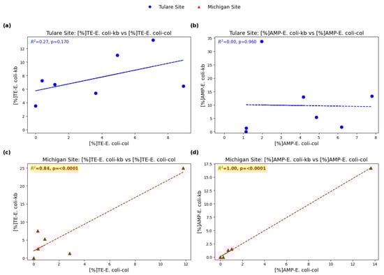 Correlation analysis between amended IDEXX and disk diffusion for AMP and TE. Percentage of EC resistant to TE as measured with tetracycline-amended Colilert-18 (%TE-E. coli-col) versus the percentage of isolates resistant to tetracycline by Kirby–Bauer (%TE-E. coli-kb) in Tulare (a) and Michigan (c). Percentage of E. coli resistant to AMP as measured with ampicillin-amended Colilert-18 (% AMP-E. coli-col) versus the percentage of isolates resistant to ampicillin by Kirby–Bauer (% AMP-E. coli-kb) in Tulare (b) and Michigan (d). Expanded data is available in the Supplemental Section (Figure S2).