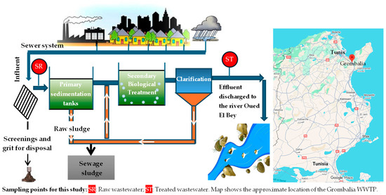 Samples of raw and secondary-treated urban wastewater were collected from the Grombalia Wastewater Treatment Plant (WWTP) in Tunisia (Figure 1) and stored at 4 °C in dark until use. The physicochemical characteristics of the raw and secondary-treated wastewater used in this study are presented in Table 3, with the concentrations of the nutrients (PO43−, NO3−, and NH4+) highlighted in bold.