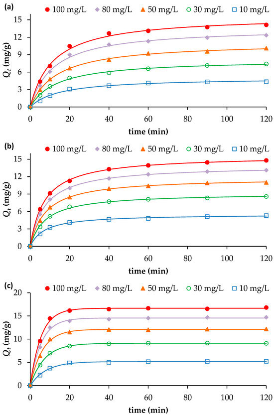The results presented in Figure 2a–c clearly show that the adsorption of NH4+, NO3− and PO43− onto the biochar is time-dependent. For NO3− and PO43−, the amounts adsorbed (Qt) increased rapidly during the first 20 min, reaching approximately 75% of the total equilibrium uptake across all initial concentrations tested. Beyond 20 min, adsorption continued to rise but at a slower rate, approaching equilibrium at about 40 min (Figure 2a,b).