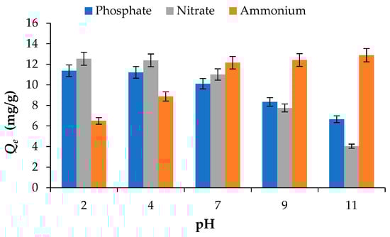 The influence of initial solution pH on the adsorption of NH4+, NO3− and PO43− was evaluated by varying pH values from 2 to 11. During these experiments, the initial nutrient concentration and adsorbent dosage were fixed at 50 mg/L and 2 g/L, respectively. The solution pH was adjusted using 0.1 M HCl or 0.1 M NaOH.