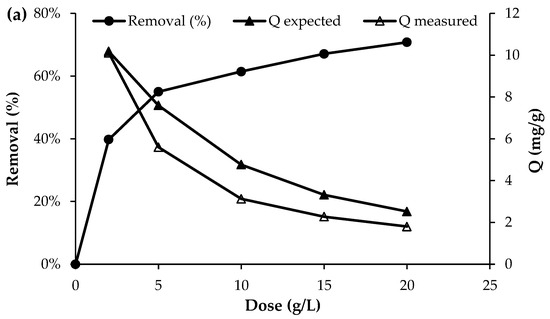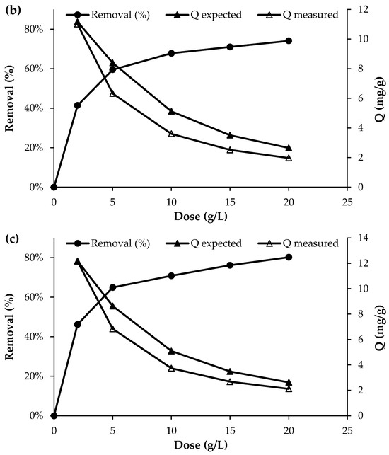 Effect of adsorbent dosage on the adsorption of (a) PO43−, (b) NO3− and (c) NH4+ (initial concentration = 50 mg/L; pH = 7; T = 25 °C; contact time = 120 min).