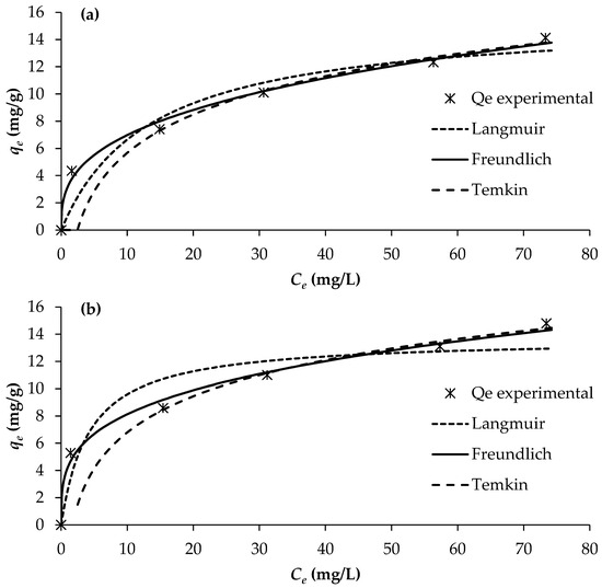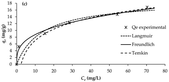 The adsorption constants obtained from the three isotherm models, together with their corresponding correlation coefficients, are presented in Table 6. Among the evaluated models, the Freundlich isotherm provided the best fit to the experimental data, exhibiting the highest regression coefficients (R2 = 0.990–0.993). This was followed by the Langmuir model (R2 = 0.805–0.920) and the Temkin model (R2 = 0.830–0.877).